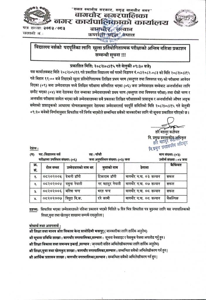 बिद्यालय नर्सको पदपुर्तिका लागि खुला प्रतियोगितात्मक परिक्षाको अन्तिम नतिजा प्रकाशन सम्बन्धी सूचना !
