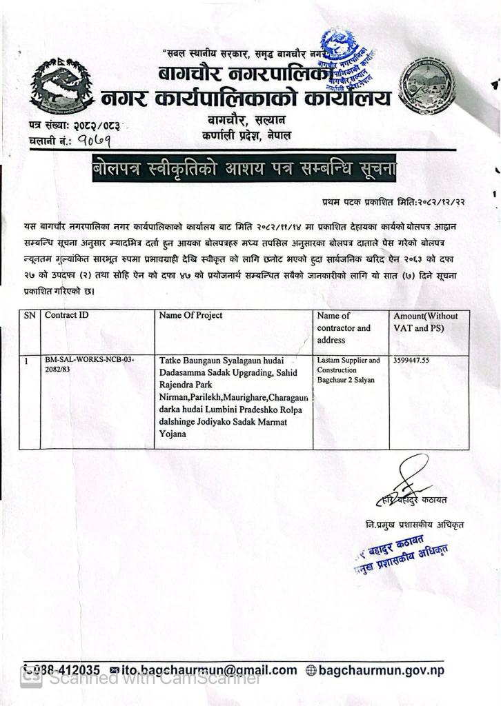 बोलपत्र स्विकृतिको आशयपत्र सम्बन्धी सूचना !