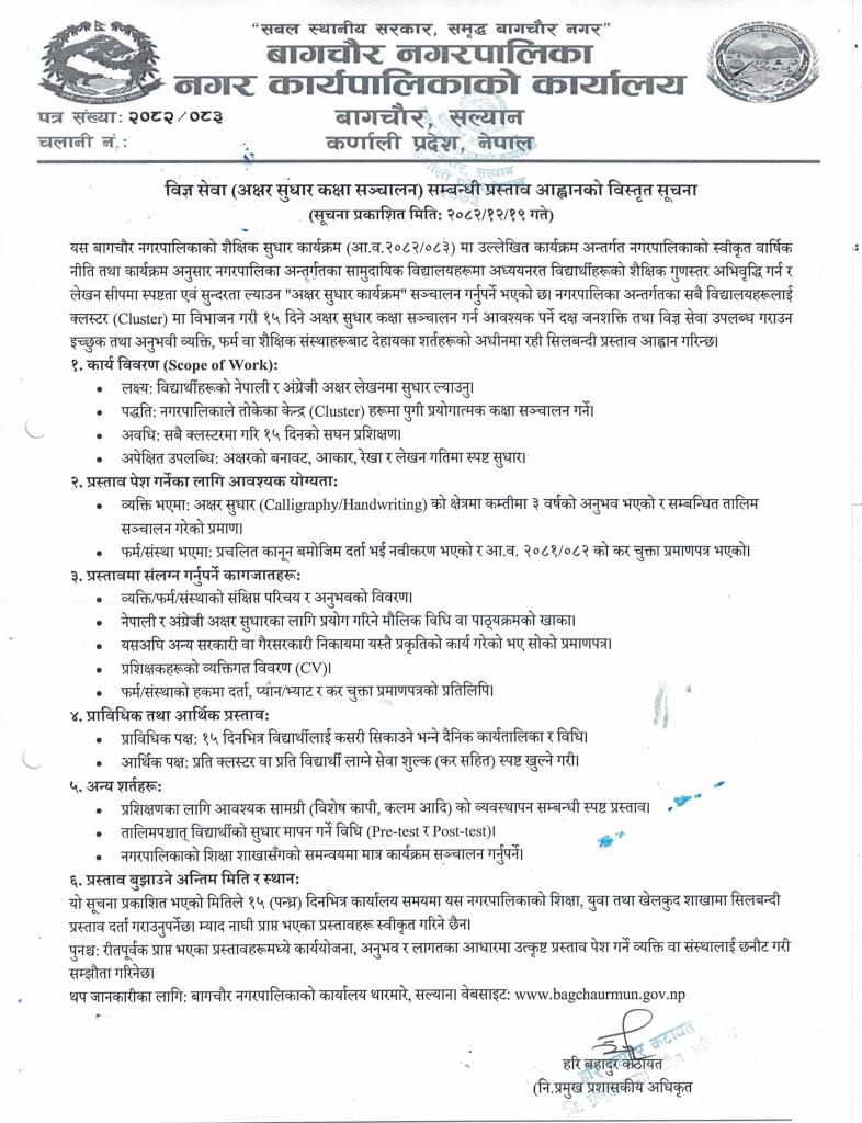 बिज्ञ सेवा ( अक्षर सुधार कक्षा सञ्चालन) सम्बन्धी प्रस्ताव आव्हानको बिस्तृत सूचना !