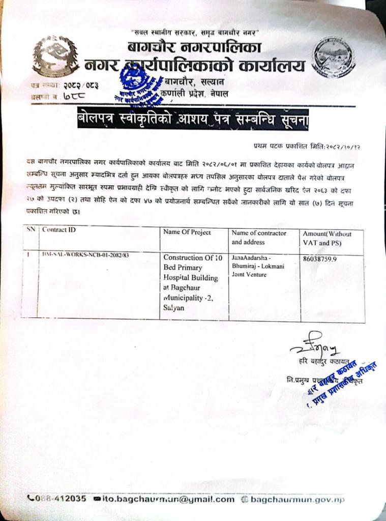 » बोलपत्र स्वीकृतिको आशय पत्र सम्बन्धी सूचना।