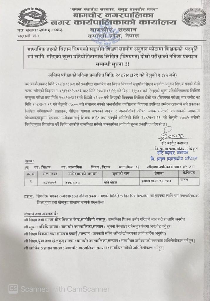 बागचौर नगरपालिका सल्यानको २०८०/८१ को Lisa नतिजा हेर्न यहाँ Click गर्नुहोस ।