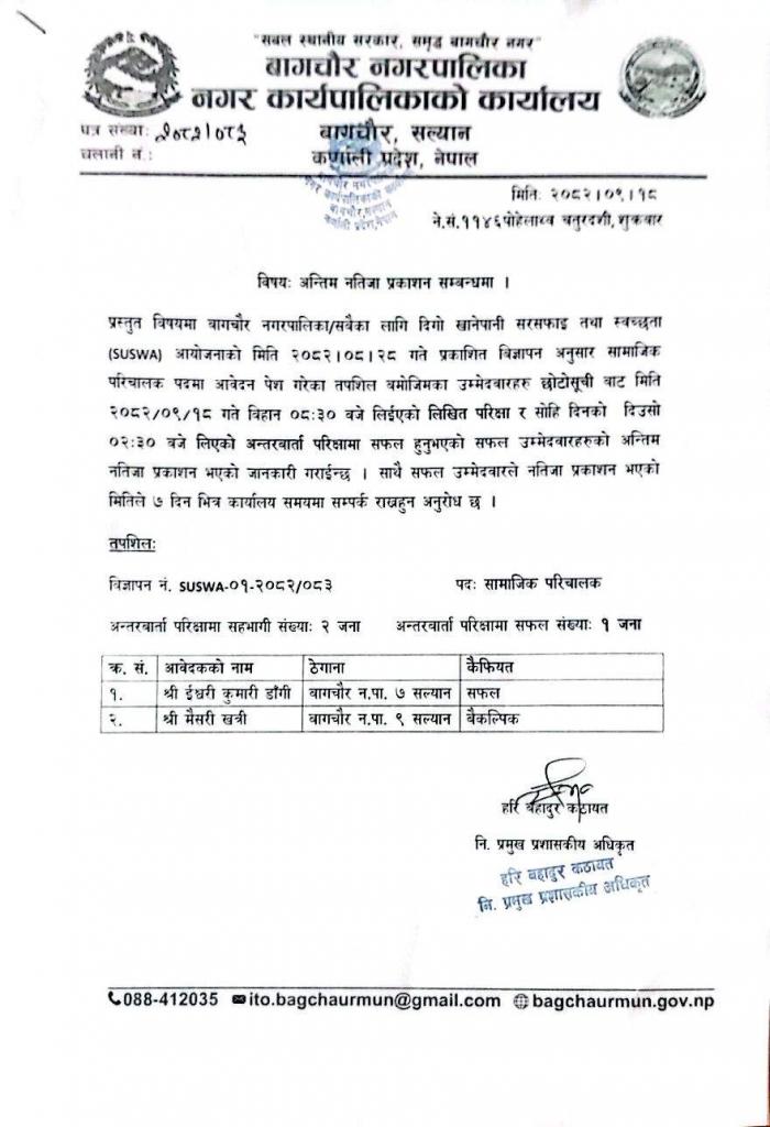 बागचौर नगरपालिका सल्यानको २०८०/८१ को Lisa नतिजा हेर्न यहाँ Click गर्नुहोस ।