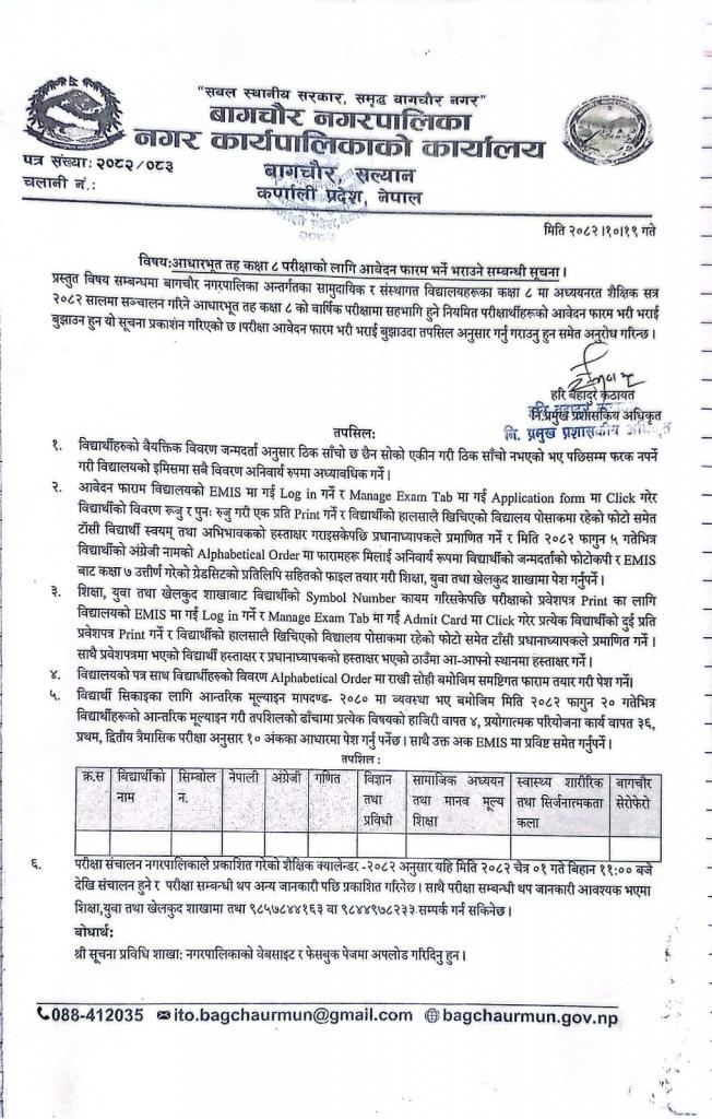 आधारभूत तह कक्षा-८ परिक्षाको लागी आवेदन फारम भर्ने भराउने सम्बन्धी सूचना ! ! !