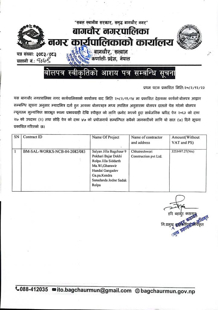 बोलपत्र स्वीकृतिको आशयपत्र सम्बन्धि सूचना !